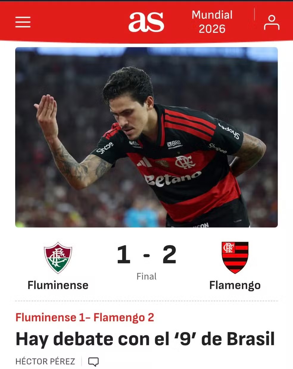 A grande atuação de Pedro no clássico entre Flamengo e Fluminense foi destaque na imprensa europeia. O jornal espanhol AS, da Espanha, colocou o atacante como candidato a uma vaga na seleção brasileira após o desempenho decisivo no Maracanã, na vitória por 2 a 1, pelo Campeonato Brasileiro, no último domingo.
