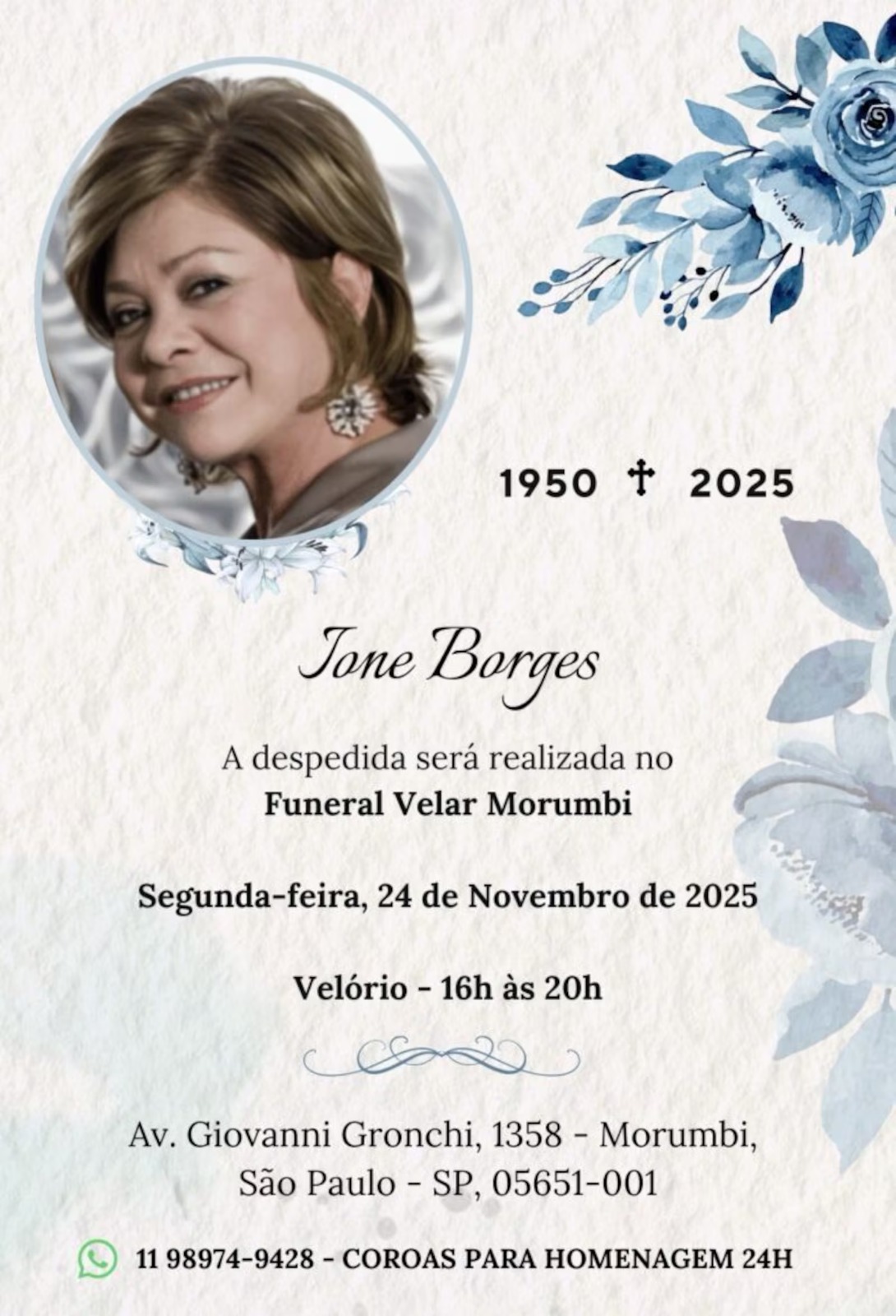 A despedida será realizada no Funeral Velar Morumbi, nesta segunda (24) das 16h às 20h. Endereço: Av. Giovanni Gronchi, 1358 – Morumbi, São Paulo – SP.