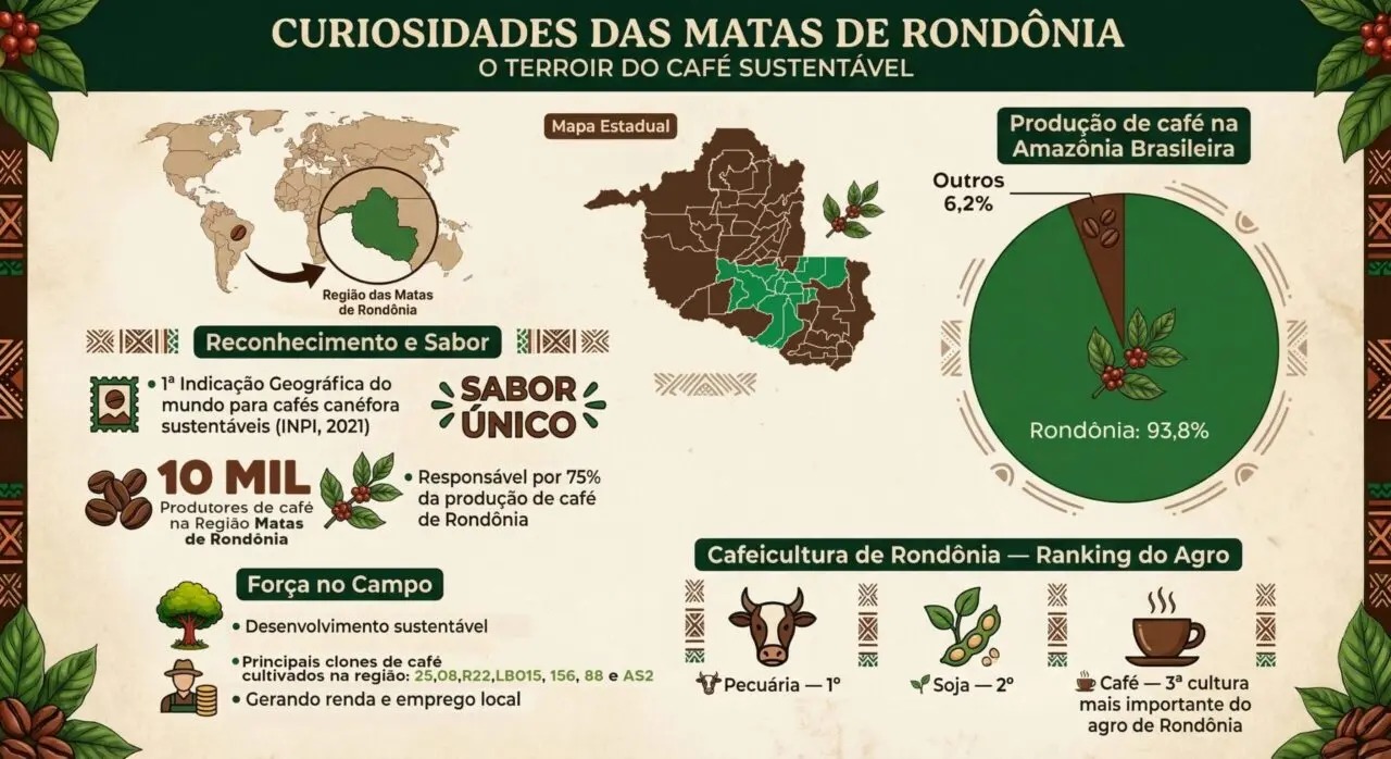 A região Matas de Rondônia, situada entre o cenário amazônico e o cerrado é responsável por 75% da produção de café do estado, contribuindo para a conquista de Rondônia no 1º lugar em produção de café da Região Norte e no bioma amazônico; e do 5º lugar no Brasil. Produz um tipo de café único no mundo, cultivado com práticas agrícolas sustentáveis. A produção recebeu, em 2021, o Selo Indicação Geográfica (IG), do tipo denominação de Origem (DO), concedido pelo Instituto Nacional da Propriedade Industrial (Inpi), vinculado ao Ministério do Desenvolvimento, Indústria, Comércio e Serviços (MDIC). É o reconhecimento do sabor, qualidade e sustentabilidade do café das Matas de Rondônia.